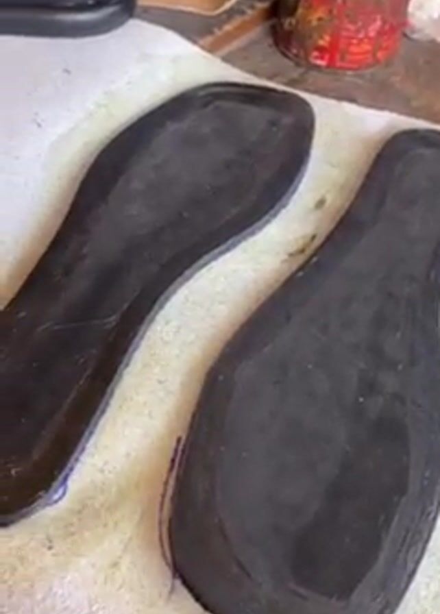 close-up of two black shoe insoles on a white paper towel. The insoles have a dark, smooth surface with subtle texture and markings. A blue line is visible along the edge of the insole on the left. Surrounding the insoles are various objects on a wooden surface: a black lid, a partially obscured object, a small brush, and a red and silver can. The audio indicates the presence of a machine or motor running in the background.