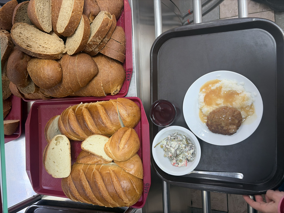 The image captures a cafeteria serving line. In the upper half, two red plastic trays sit on a stainless steel counter, displaying bread. The left tray contains several light-colored, crusty bread loaves, partially sliced, with prominent diagonal scoring; one large slice reveals the white interior. The right tray holds a multitude of darker, brown rye bread loaves and slices. Both trays feature "ХЛЕБ" (KLEB) in Cyrillic, marked in black on their front edges. Below this, a dark brown plastic serving tray is partially held by a person's hand, clad in a light-colored sleeve, at the bottom-left. On this tray, a white oval plate holds a portion of white, granular food (likely rice or mashed potatoes) topped with a single round, brown patty and light brown gravy. Adjacent is a small white bowl containing a salad composed of green strips (resembling seaweed), white oblong pieces (possibly imitation crab), and green peas, mixed in a creamy dressing. A clear glass contains a dark red liquid, likely a fruit compote or juice. A silver utensil handle rests near the salad bowl. The background features stainless steel surfaces and horizontal railings, indicative of a typical food service environment. The scene is consistent with a public canteen or institutional dining facility located in the city of Hrodna, Belarus.