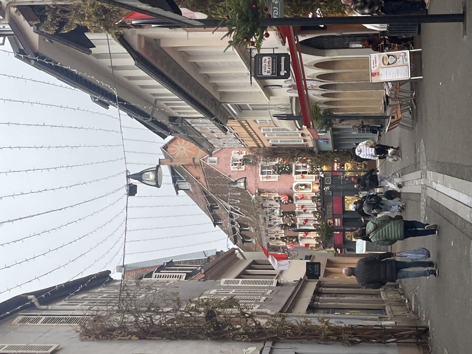 This image depicts a pedestrian street in the city of Sélestat, France, under an overcast sky. The street is lined with multi-story buildings of varying colors and architectural styles, predominantly featuring pitched roofs and windows with closed or partially open white shutters. Overhead, numerous strings of small white decorative lights are suspended across the street, forming a canopy, with a larger, bell-shaped streetlamp also visible. On the left, a grey building with numerous windows is partially covered in dried vines. Further down the street on the left, a red and white flag hangs from a facade. In the midground, a prominent pink-hued building with a steep reddish-brown tiled roof is extensively decorated for a festive season, featuring wreaths and lights around its windows. The ground floor of this building displays a sign with "KOENIG." An older building behind and to the right of the pink one features a yellow sun-like design on its upper gable. On the right side of the street, lighter-colored buildings house businesses. One notable establishment, "Restaurant Ville De Reims Brasserie," is identified by a hanging sign. This restaurant features an arched facade at street level and an outdoor seating area with several empty tables and chairs. A white sandwich board sign advertising coffee is placed near the seating area. Small decorative fir trees are visible along this side of the street, and a grey pole with "FDJ" (Française des Jeux) is present on the far right. Approximately 15-20 individuals are present on the street. In the foreground-midground, a man in a dark jacket and blue jeans, carrying a blue bag, walks away from the viewer alongside a woman in a green puffer jacket. Further along, several other pedestrians are walking, including individuals in dark clothing and a person in a white puffer jacket walking a small, fluffy white dog on a leash. Another individual is walking a darker, medium-sized dog. A few people are seated at the outdoor cafe tables on the right, and others are standing near storefronts. The overall scene suggests a moderately busy commercial street.