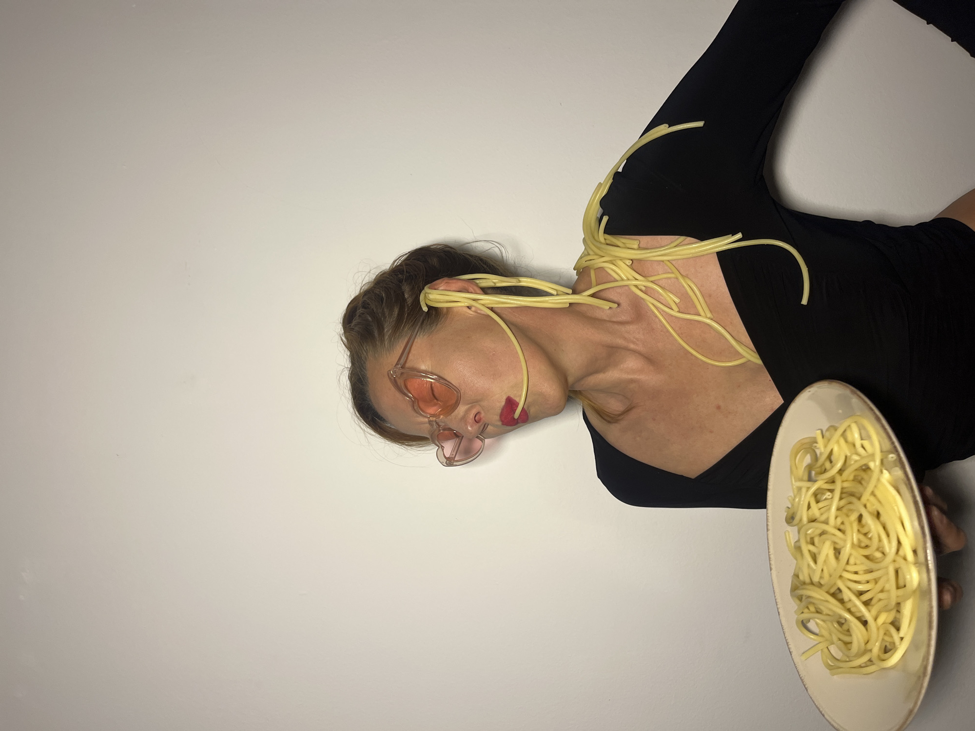 An adult female subject is depicted from the mid-torso up, centered against a plain, light-colored wall in what is identified as Budva, Montenegro. She possesses light brown hair, pulled back, and wears pink, heart-shaped eyeglasses and red lipstick. Cooked spaghetti noodles are draped over her head, right ear, neck, and the shoulders of her black, long-sleeved top, which features a low neckline. One strand of spaghetti is observed protruding from her mouth. Her left hand supports an oval, light-colored plate filled with additional cooked spaghetti. The subject's gaze is directed towards her left.