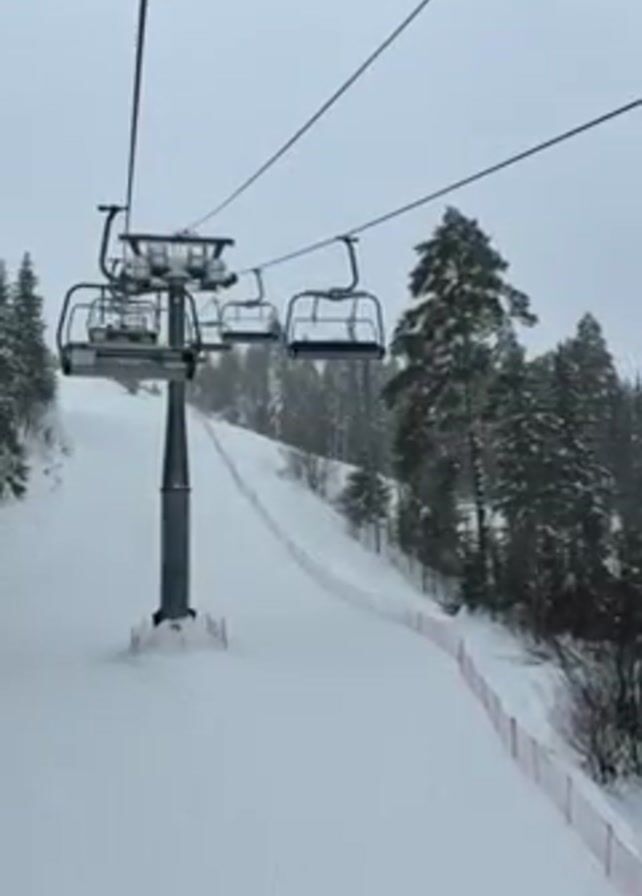 chairlift going uphill over a snow-covered ski slope. The chairlift has several empty chairs, and a few skiers' tracks are visible on the slope. A red net marks the edge of the ski area, and pine trees covered in snow stand on either side of the slope. The sky is overcast.