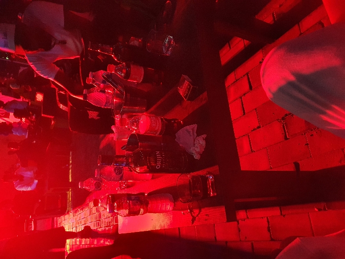 This image depicts a nighttime scene at an outdoor or semi-outdoor entertainment venue, likely a bar or lounge, in the city of Unknown, Unknown. The entire environment is saturated with intense red artificial lighting. In the foreground, a dark wooden or metal table is visible. On this table, from left to right, are several plastic water bottles, a dark glass bottle labeled "ORIJI N," a metal ice bucket containing bottles and ice, a smaller clear bottle with a red label, and a dark glass bottle. A clear glass containing a dark liquid is situated in the bottom left, and another empty clear glass is on the far right. A crumpled white tissue and a dark red pack of cigarettes are also on the table. The lower right foreground shows the bent knee and thigh of a person, likely the photographer, wearing light-colored trousers. To the right of the table, a male individual with dark skin, wearing a light-colored t-shirt and a light-colored cap, is leaning forward, seemingly interacting with items on the table. His right arm is extended towards the table. In the mid-ground and background, multiple individuals are seated or standing around other tables and chairs, their features largely obscured by the red lighting and distance. One person in the mid-background appears to be wearing a white long-sleeved shirt. The ground beneath the table and surrounding area is paved with rectangular, reddish-brown bricks. The overall ambiance suggests a lively, social gathering in a dimly lit setting illuminated by the dominant red light source.