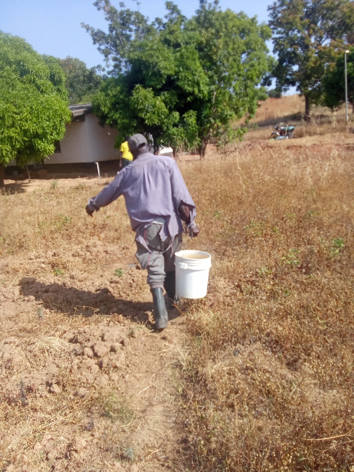 An individual, viewed from behind, walks rightward on a dirt path in Bar Jirgi Summa, Nigeria