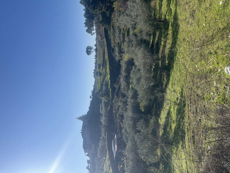 A wide-angle landscape photograph displays a rural, hilly environment in Macedo de Cavaleiros, Portugal, under a clear, bright blue sky with a prominent sun flare in the upper left. The foreground and midground consist of undulating green slopes extensively covered by olive groves, characterized by numerous, evenly spaced olive trees with silver-green foliage. In the mid-left, a small, single-story utilitarian building with a light-colored, potentially corrugated metal roof is partially visible. On a distant hilltop towards the upper left, a large, multi-story building, appearing light-colored, is situated adjacent to a tall, conical evergreen tree. Further to the right in the background, a dense cluster of slender, coniferous trees forms a distinct woodline on another elevated area. The ground cover consists of varied green grass and some patches of drier vegetation. No individuals, animals, or specific actions are observed within the frame.