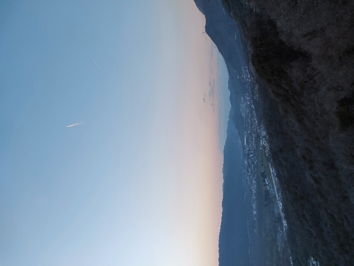 The image displays a wide panoramic vista overlooking the urban area of Svinjišta, Montenegro, during either dawn or dusk. The upper portion of the frame is dominated by a clear sky, transitioning from a light blue at the zenith to a soft gradient of pale pink and orange closer to the horizon. Two distinct aircraft contrails are visible in the sky; one prominent, segmented, and brightly illuminated trail angles upwards in the upper left quadrant, while a second, fainter, and shorter trail is located to its right and slightly lower. A single faint luminous point, consistent with a star or planet, is discernible near the center of the sky, just above the distant horizon. The midground reveals the settlement of Svinjišta situated within a valley, characterized by numerous buildings and scattered artificial lights indicating human presence. A body of water, likely a river, meanders through the valley, exhibiting reflective properties. This valley is flanked by a series of dark, undulating hills and mountains that extend into the background. The immediate foreground consists of a densely vegetated hillside, largely covered by dark, bare deciduous trees, suggesting a dormant winter or early spring season. The terrain here appears rugged and steeply sloped. No people, active subjects, or interactions are visible within the frame.