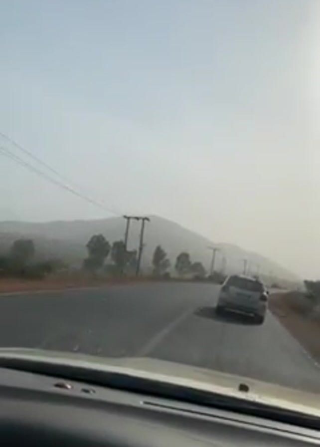 car driving down a road, with a light-colored car ahead in the same lane. The sky is bright, and there appears to be a hazy or smoky atmosphere. Trees line the side of the road with power lines running along the roadside. There is a mountain in the distance, obscured by the haze. The video is filmed from the perspective of the driver.