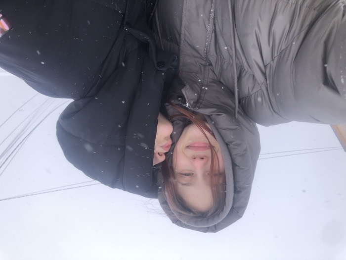 The image captures two individuals outdoors in the city of Foki, Russia, during active snowfall