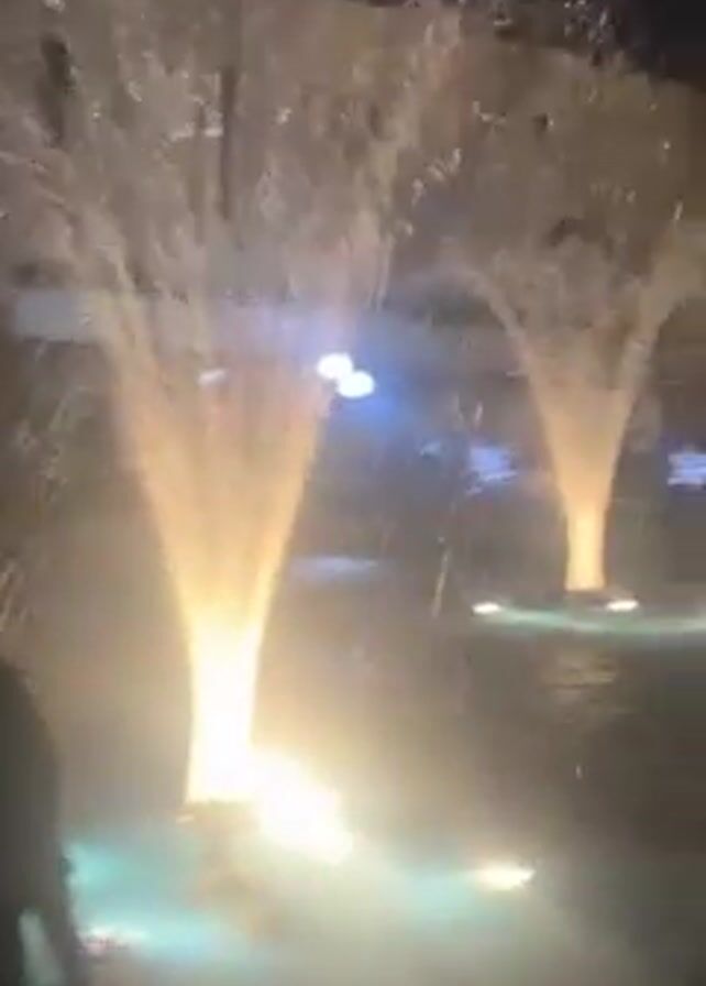 nighttime scene of a fountain and Christmas decorations. The camera is initially close to the fountain, and the person holding the camera walks towards it. The fountain is lit with bright lights, and water is spraying high into the air. In the background, there is a Christmas tree with lights. The camera then pans to the right, showing a building with lights. The building has a modern design, with slanted walls and windows. There are bushes in front of the building, also decorated with lights. The overall scene is festive and bright.