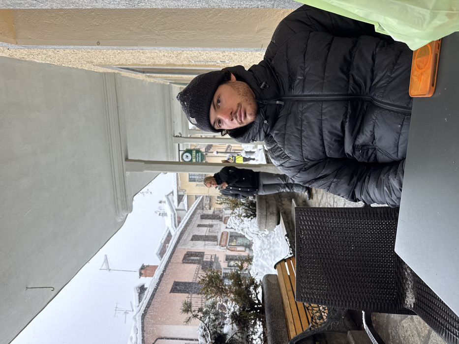 The scene depicts a snowy outdoor environment in Limone Piemonte, Italy, viewed from under a covered portico. In the foreground, a young adult male is seated at a dark rectangular table in a dark, woven outdoor chair. He wears a black knitted beanie and a black puffer jacket, both lightly dusted with snow. His dark hair is visible beneath the beanie, and he has light facial stubble. His eyes are directed slightly off-camera to the right. An orange-cased smartphone rests on the table to his right, adjacent to a partially visible light green plastic bag. In the mid-ground, a blonde female individual stands, facing right, holding a dark object to her mouth. She is dressed in a dark jacket and grey trousers. Behind her, a street is covered in snow, and another person in a yellow garment is partially visible further down the street. The environment is characterized by heavy snowfall, with snow covering the ground, rooftops, and planters. Evergreen shrubs in the planters are also laden with snow. Buildings in the background feature multi-story structures with pitched, reddish-brown tiled roofs. A sign for a "FRUTTERIA FRUTTA E VERDURA" (fruit and vegetable shop) is affixed to a building facade. The overhead portico ceiling is light-colored, with a small metal hook suspended from it in the upper left quadrant of the image. Pillars supporting the portico are visible on the right.