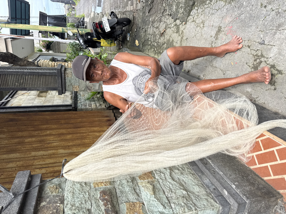 - "This image captures an elderly male individual seated on a concrete ledge, engaged in the maintenance of a light-colored fishing net, within an urban setting in Kuta, Indonesia" by FM-Ribsj1, licensed under CC BY 4.0
