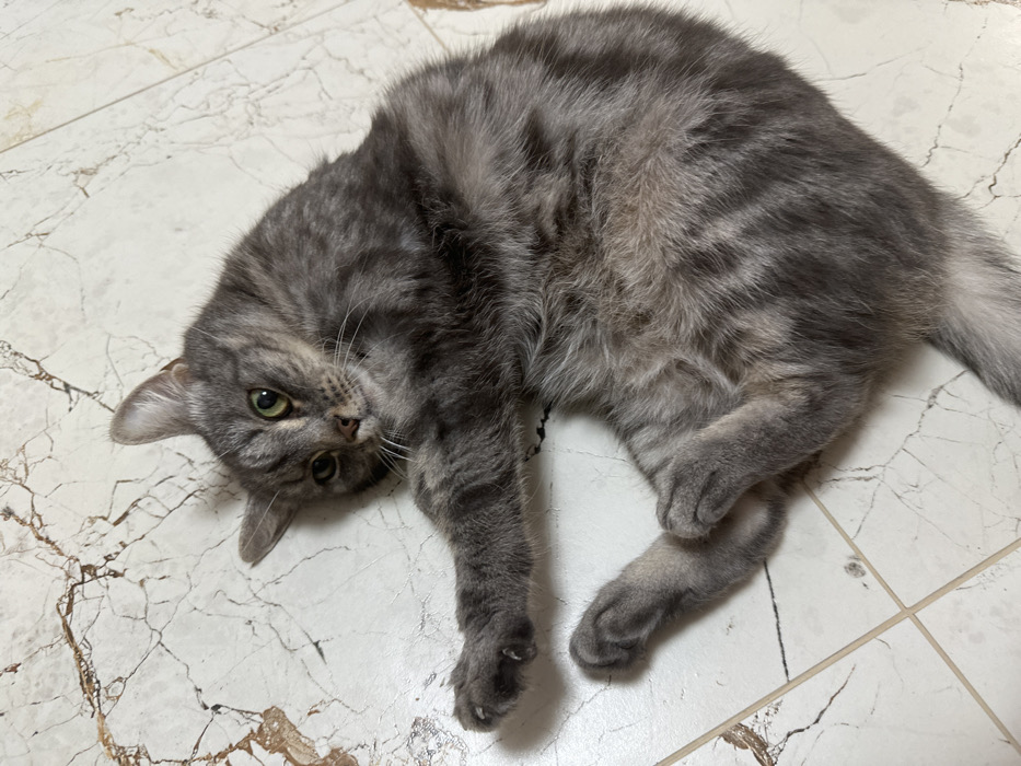 A gray tabby cat lies on a white and beige tile floor with dark veining
