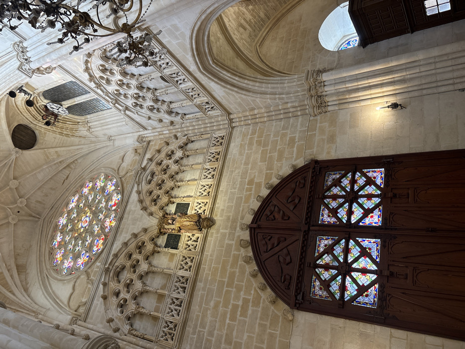 This image displays the interior of the Burgos Cathedral in Burgos, Spain. The scene is dominated by intricate Gothic architecture, primarily constructed from light-colored cut stone. In the upper-left portion, a large, ornate circular rose window with complex stone tracery is filled with colorful stained-glass panels. Directly below this rose window, a horizontal gallery extends, featuring detailed openwork stone tracery and a series of small arched openings. Centrally positioned within this gallery is a gilded or light-colored statue of a robed figure, set within a niche. To the immediate left of the statue, a dark rectangular plaque with partially visible light-colored text, including "ALPHONSUS," is mounted on the wall. The lower section of the image features a prominent, arched double-leaf wooden door. The upper portion of this door includes carved decorative elements, and the stone arch directly above it is adorned with a series of carved human faces. Each leaf of the door incorporates a square section with geometric stained-glass patterns. To the right, the cathedral's structure continues upwards, revealing high, ribbed vaulted ceilings and large pointed arches that define the interior space. A substantial, multi-branched metal chandelier, possibly bronze or iron with decorative elements, hangs from the ceiling in the upper-right quadrant. High in the upper-right corner, a dark, mechanical-looking apparatus with visible gears is present. On the lower right wall, a single wall-mounted sconce with an illuminated light source is affixed to the stone. Further to the right and lower, a partial view of an arched window with stained glass is visible, along with dark wooden paneling below it. No people are present in the scene.