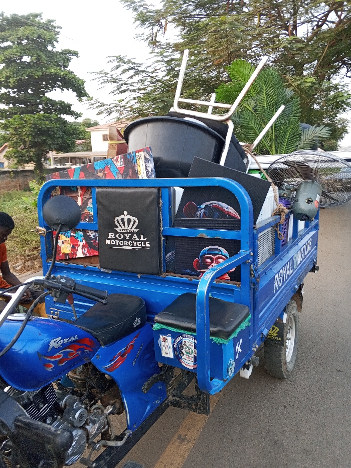 A blue Royal motorcycle tricycle is overloaded with items. On the vehicle bed, there is a black bucket, white chairs, artwork, a fan, and other miscellaneous items. The tricycle has the words "Royal Motorcycle" and "Royal Motors" prominently displayed. It's parked on a paved road with trees and a house in the background. An individual is standing to the left of the motorcycle.