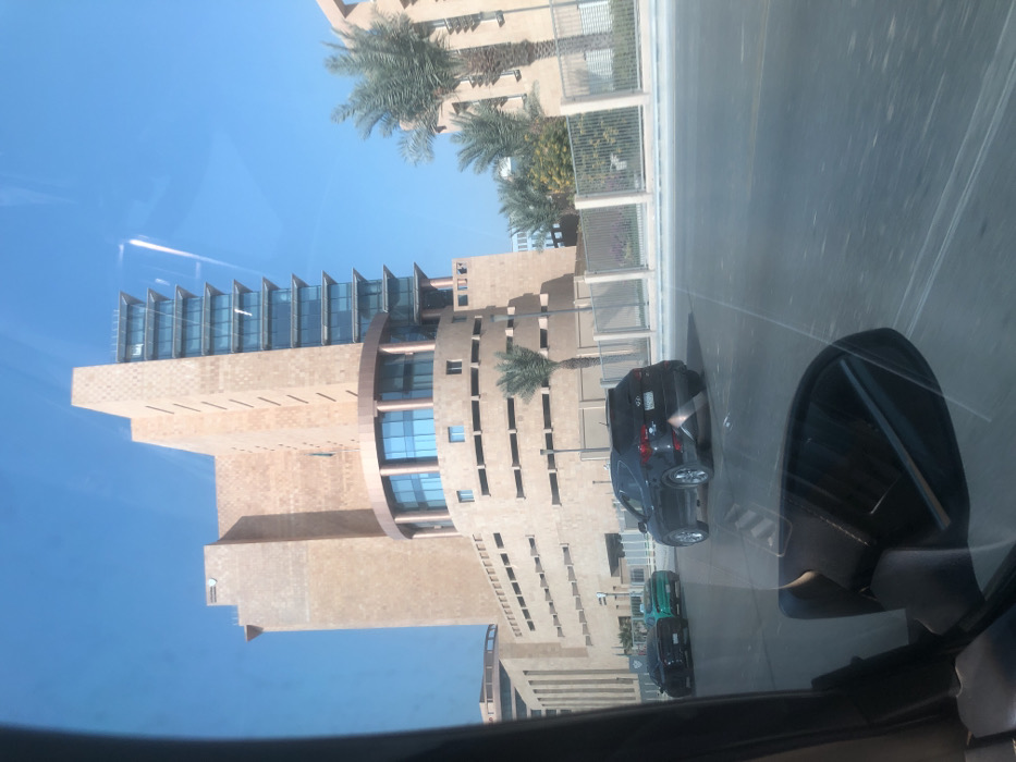 A modern beige building with blue-tinted glass accents dominates the view. Palm trees line the street. A dark-colored car is parked nearby, and glimpses of another car are visible behind it. The image is captured from inside a vehicle, as evidenced by the rearview mirror prominently displayed in the foreground. The sky is a clear, bright blue, suggesting a sunny day.