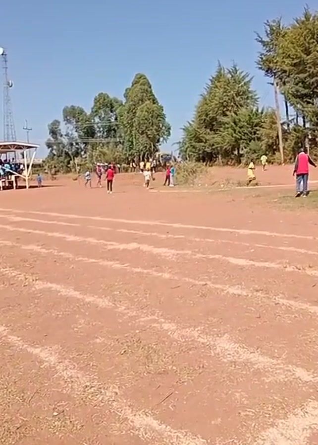 group of runners on a reddish-brown track on a sunny day. Several people are positioned along the track, apparently observing or participating in the race. There is a small, covered structure to the left of the frame. In the background, there are trees, a tower, and a glimpse of a yellow vehicle. The camera is focused on the track, capturing the ongoing race.