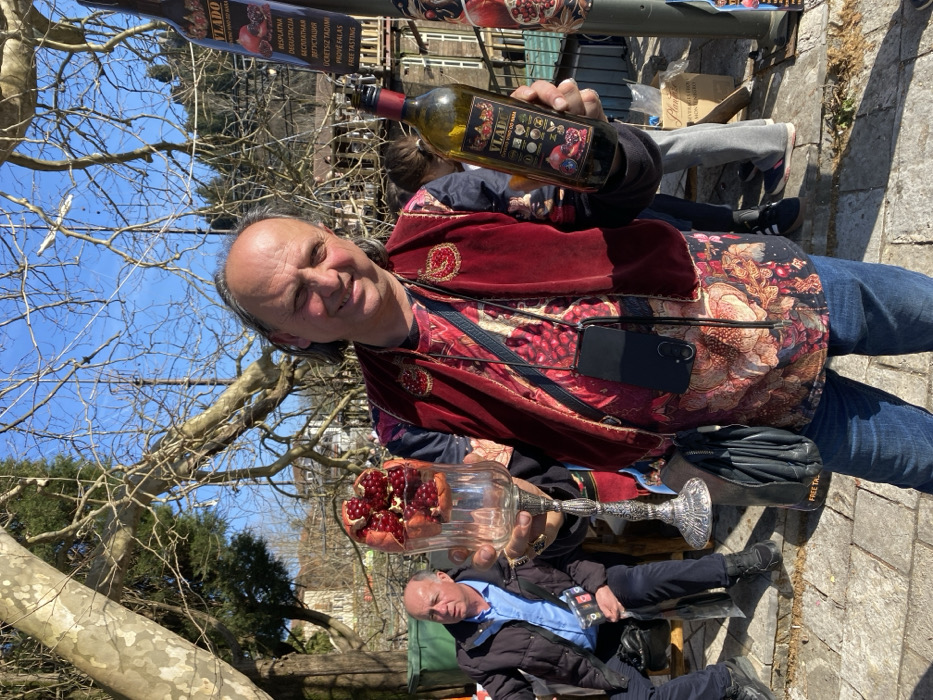 - "A smiling, middle-aged man stands outdoors in Virpazar, Montenegro, holding a large, ornate silver-stemmed glass with a split pomegranate in his left hand and a dark glass bottle of "VLADO VINO OD NARA" (pomegranate wine) in his right hand" by FM-gzVUI2, licensed under CC BY 4.0