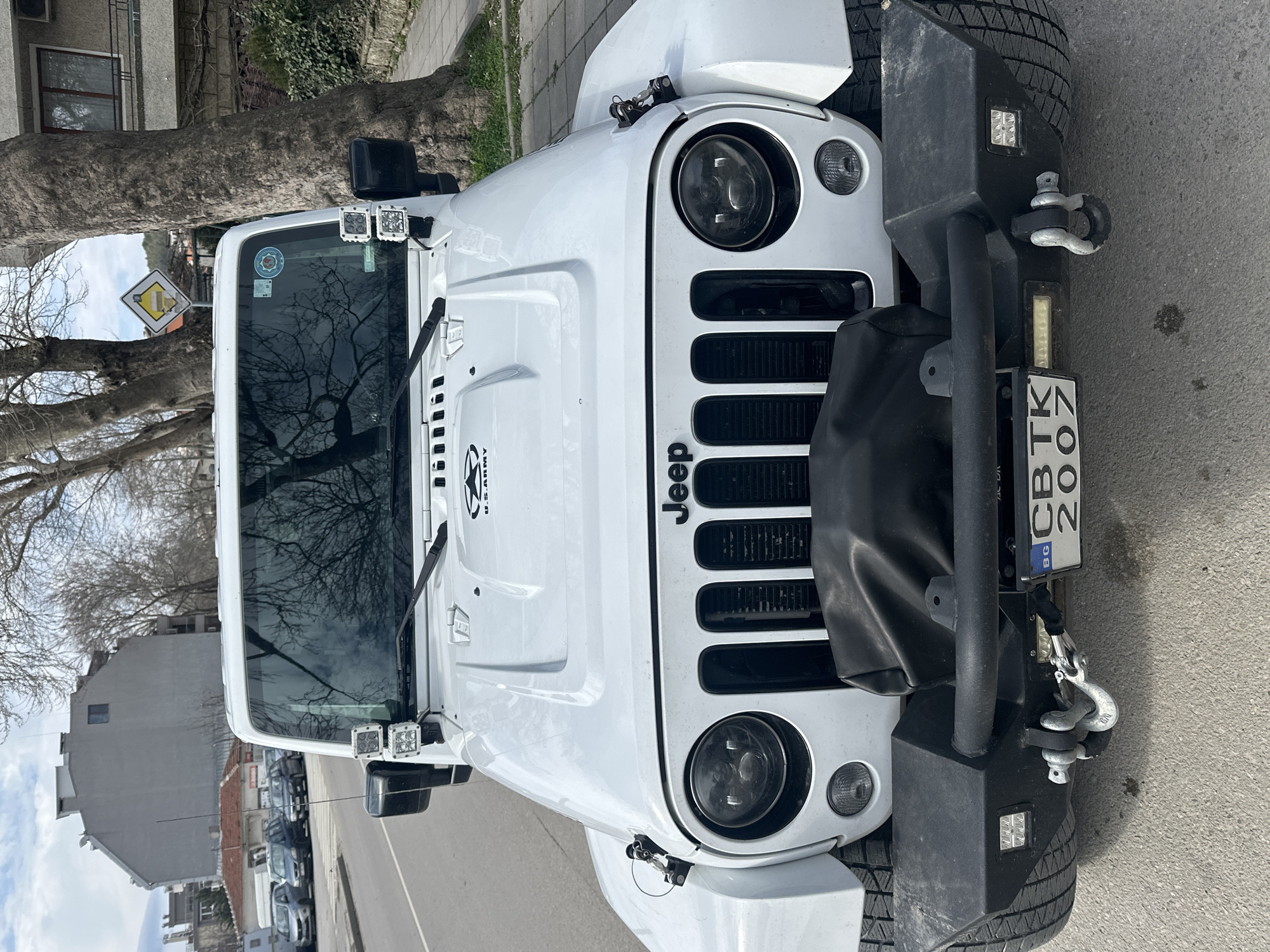front of a white Jeep Wrangler parked on a street in what appears to be an urban environment. The Jeep has aftermarket modifications, including a black front bumper with integrated lights, tow hooks, and a protective bar. A black cover is partially obscuring the Jeep's grille. The vehicle's license plate reads "CB TK 2007" and indicates it is from Bulgaria. The hood features a "U.S. Army" logo. The Jeep has additional lights mounted on the A-pillars. The background includes buildings, trees (some without leaves), and other parked cars. A road sign is visible near the tree. The scene appears to be during daylight hours. Based on the license plate, the image is most likely taken in or around Varna, Bulgaria.