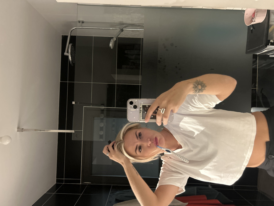 A woman is depicted in a mirror selfie within a modern bathroom located in Chambœuf, France. She has short blonde hair with visible darker roots and wears a white cropped t-shirt and dark lower garments. Her right hand holds a light purple smartphone, capturing the reflection, and features a prominent rectangular ring on a finger. A blue and white toothbrush is positioned in her mouth, while her left hand is raised and touching the top of her head. A circular, sun-like tattoo is visible on her left forearm. The bathroom features black tiled walls, a white ceiling from which a bare incandescent lightbulb is suspended, and a shower enclosure with clear and partially frosted glass panels. The shower contains both a fixed rain showerhead and a handheld unit. Reflected in the mirror on the left are red and grey towels, and on the lower right, a small pink container rests on a dark surface.