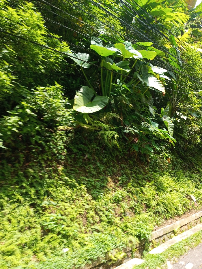 This image captures a densely vegetated hillside in Cipanas, Indonesia, bathed in bright sunlight. The central and upper-mid sections feature multiple large, broad, spade-shaped green leaves, indicative of plants like taro (Colocasia), growing amidst a variety of smaller green foliage and ferns. Several dark electrical or communication wires are strung horizontally across the upper third of the scene, partially obscured by the dense greenery. The lower portion of the image displays a steep embankment covered predominantly with bright green ferns and ground cover, exhibiting motion blur. At the bottom right, a concrete retaining wall is visible, bordering what appears to be a paved surface. No individuals or animals are present in the scene.