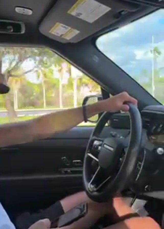 interior of a car, likely a Range Rover, from the driver's perspective. The driver, a male, is visible in the left side of the frame, holding a smartphone in his left hand while driving. He is wearing shorts and a bracelet. The dashboard and steering wheel are prominent in the shot, revealing luxury car features. Outside, palm trees and other greenery line the road, indicating a tropical or subtropical environment. As the car moves, the camera shows the dashboard display and the road ahead. A silver BMW is visible ahead of the Range Rover. The scene is bright and sunny, indicating daytime. Music plays in the background. The primary action involves driving and using a smartphone, suggesting a possible distraction.