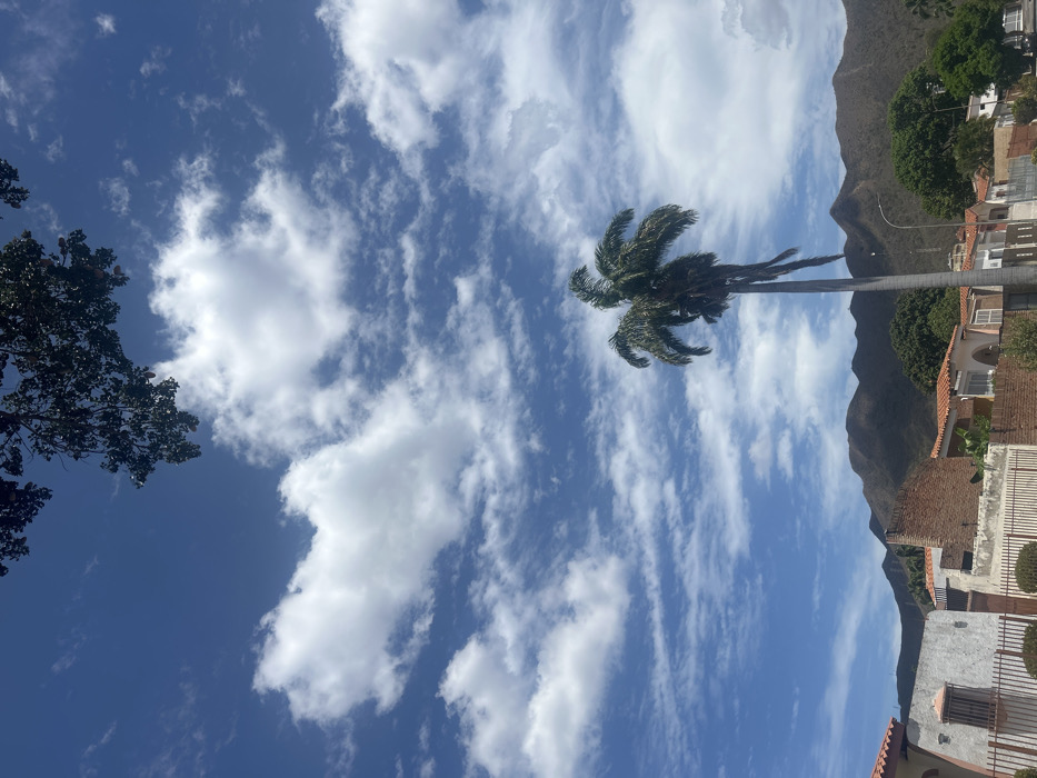 The image depicts a residential street scene in Valencia, Venezuela, under a clear, bright blue sky with scattered white clouds