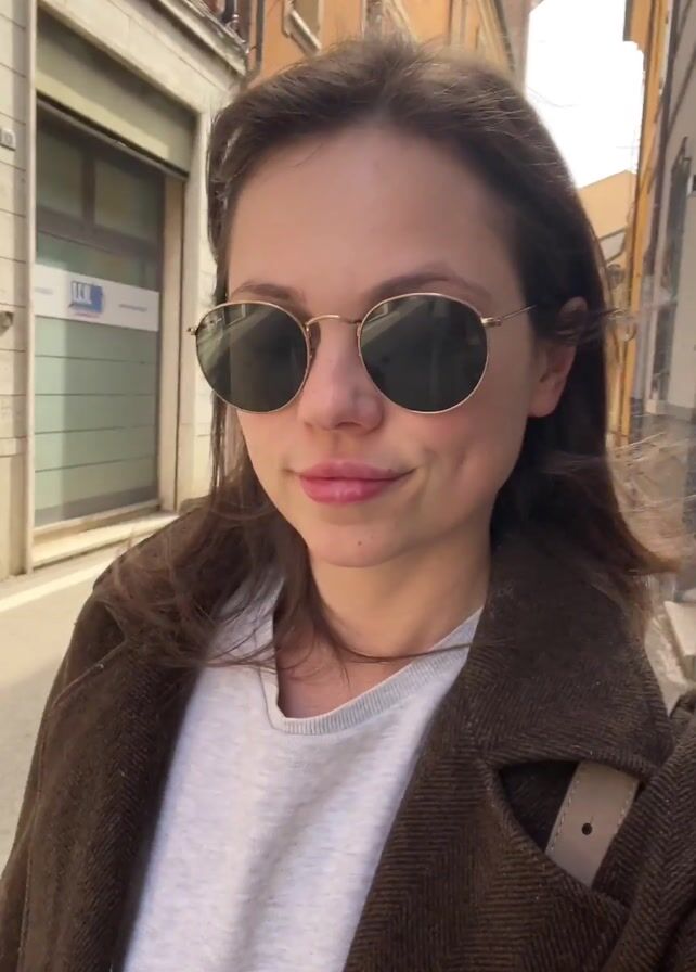 A young woman, fair-skinned with brown hair and wearing round sunglasses, a brown coat, and a white t-shirt, is walking down a narrow street in a European town. The buildings on either side of the street are painted in shades of yellow and orange. The woman is recording a video with her phone, facing the camera and smiling. The street is mostly empty.