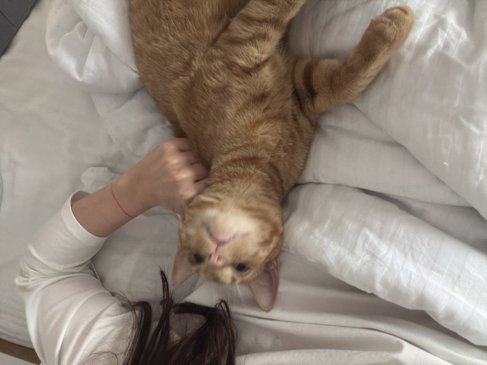 The scene is set indoors in Rafailovići, Montenegro. An orange tabby cat is positioned on white bedding, comprising sheets and a pillow. The cat's head is tilted upward and slightly to its right, with its gaze directed towards the top of the frame. A person, wearing a long-sleeved white top, is visible, with their left hand positioned around the cat's neck/chin area, appearing to pet or scratch it. A thin red string bracelet is worn on the person's left wrist. The cat's left front paw extends towards the lower left portion of the image. A dark-colored object, likely electronic, is partially visible in the bottom right corner of the frame.