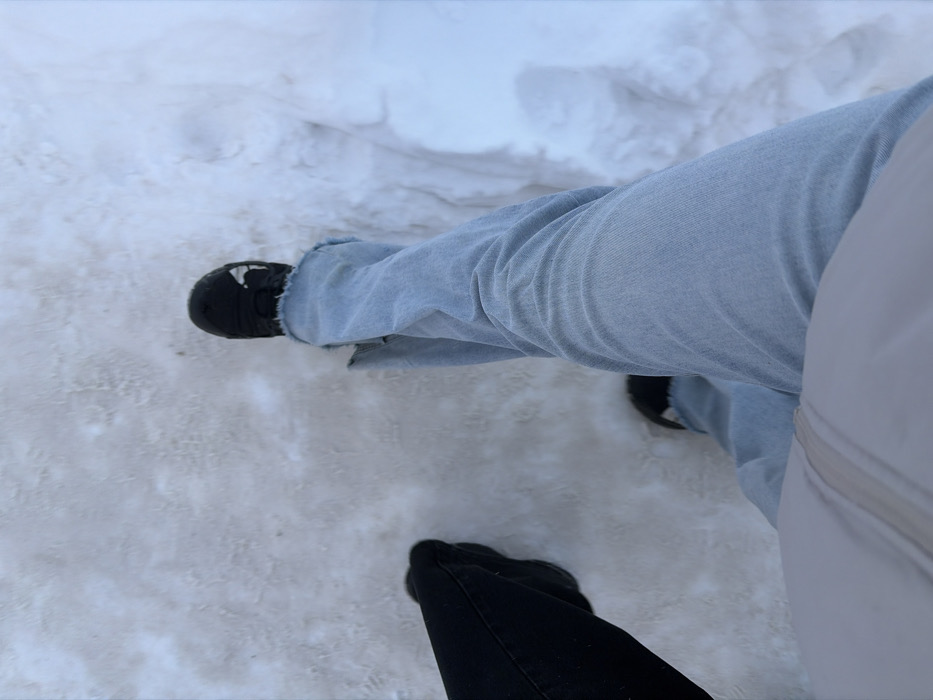 The image presents an overhead view of two individuals' lower bodies traversing a snowy and icy outdoor path in Chaikovsky, Russia. The ground consists of compacted snow and ice, exhibiting an uneven texture. To the right, the path borders a deeper accumulation of undisturbed snow. The individual on the right wears light blue denim jeans with visibly frayed cuffs and black footwear, possibly boots, featuring a distinct white marking on the top of the right shoe. The lower portion of a light-colored (likely white or light grey) jacket or coat, with a visible central zipper, extends into the bottom of the frame, belonging to this individual. The individual on the left is partially visible, wearing dark (likely black) pants and dark footwear, with only their lower left leg and foot present in the left foreground. Both subjects are positioned as if walking or standing side-by-side along the path.