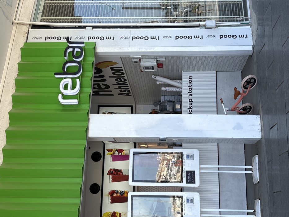 The image displays the exterior of a commercial establishment identified as "rebar" in Ashkelon, Israel, under bright daylight conditions