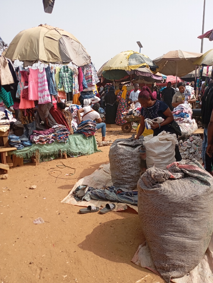 This image depicts an outdoor market scene in Nyanya, Nigeria, under hazy daylight conditions
