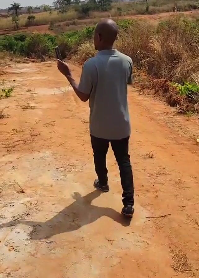 A bald man is walking away from the camera on a dirt path. He is wearing a grey short-sleeve shirt, black pants, and shoes. He is holding a cell phone in his right hand and looking at it. His shadow is visible on the path. The path is surrounded by dry grass and dirt. In the background, there are trees and some buildings. The sky is overcast.
