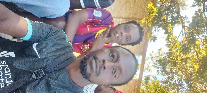 A selfie image captured outdoors in Unknown, Unknown, depicts a group of four adult males under strong natural light. The primary subject, located in the foreground and appearing to hold the camera, is a dark-skinned male with a short beard and dark, closely cropped hair. He wears a dark gray/black short-sleeved Nike t-shirt with a white swoosh logo and a partially visible "Standard Chartered" logo. A black shoulder bag with a gray buckle strap crosses his chest. A multi-colored beaded bracelet is visible on his left wrist. To his left, in the midground, another dark-skinned male with dark, curly hair faces the camera. He wears a red and purple FC Barcelona jersey. His right hand forms a peace sign, and a slender, cylindrical object is held in his mouth. To the far left, a portion of a third individual wearing a dark blue and white striped shirt is visible. To the far right, a fourth individual, wearing a white shirt and a red bandana, is partially visible. The background consists of a light-colored, possibly concrete or stone, wall. Above the subjects, lush green and yellow tree foliage is prominent against a bright sky, indicating an outdoor setting during daylight hours.