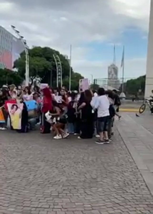 group of approximately 30 people gathered in a public square, likely in a city. Most of the individuals appear to be young adults or teenagers. They are holding up signs with images, predominantly of a young man, possibly a celebrity or musician. Some signs have writing on them as well. The group is standing on a paved area with a cobblestone-like pattern. In the background, there is a tall, white obelisk-like structure, as well as a modern building with large signs. A person on a bicycle rides by in the distance. The weather appears overcast. The group seems to be expressing enthusiasm or support, possibly related to the person featured on their signs.