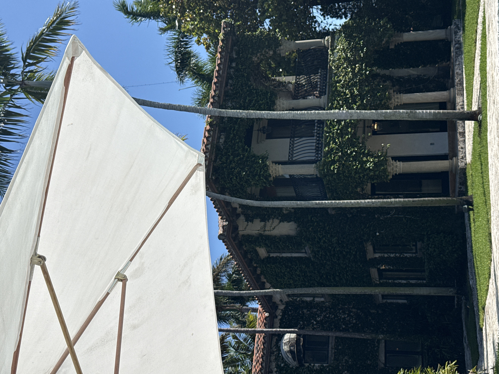 The image depicts a partially visible white parasol in the foreground, juxtaposed against a building facade heavily covered in greenery in the background. Palm trees are visible, adding to the tropical setting. The location is Miami Beach, United States of America, suggested by the architectural style of the building and the presence of palm trees. The building's design includes architectural details like a red-tiled roof and what appears to be a balcony. No people are visible in the shot.