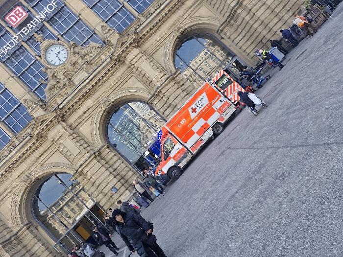 The image displays the exterior of Frankfurt Hauptbahnhof in Frankfurt, Germany. The large, ornate, light-colored stone building occupies the background, featuring multiple arched entrances with reflective glass and a prominent clock displaying approximately 12:40. Above the arches are numerous rectangular windows. A white and orange striped ambulance, marked "DRK," "NOTFALLMEDIZIN," and "Rettungsdienst," is centrally positioned on the grey paved forecourt. Blue emergency lighting elements are visible on its roof. In the foreground, a person in dark clothing pushes a white wheelchair with an occupant towards the rear of the ambulance. Several other individuals, some in dark clothing and others in high-visibility vests, are observed near the ambulance and closer to the station entrances. Additional pedestrians are visible walking near the left side of the station's facade. Reflections of nearby architecture are discernible in the station's glass surfaces.