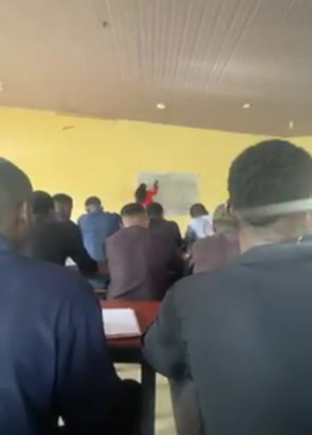 classroom of students, likely in a secondary or higher education setting, seated at desks facing a whiteboard. The classroom has yellow walls and a white ceiling. A teacher, wearing a red jacket, stands at the whiteboard writing equations or notes, engaging in what appears to be a lesson. The students are primarily facing the board, presumably following the lecture. The camera is positioned at the back of the classroom, giving a view over the students' heads towards the teacher and the whiteboard. Some students have notebooks or papers on their desks, suggesting they are taking notes.