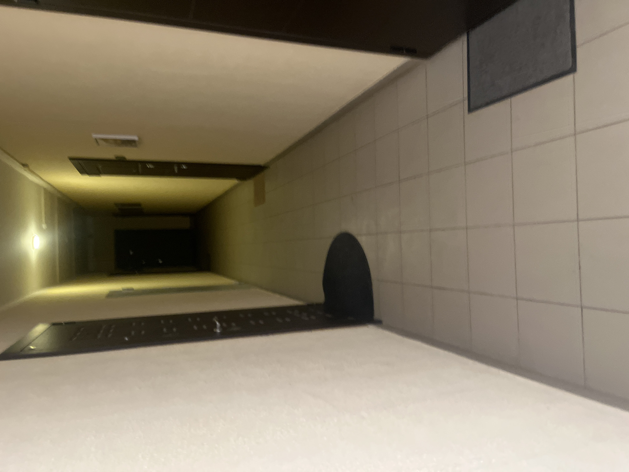 This image appears to be taken inside a building in Podolsk, Russia. It shows a long, tiled hallway with a dark alcove on one side and an access panel on the floor. The lighting is poor and the details are indistinct.