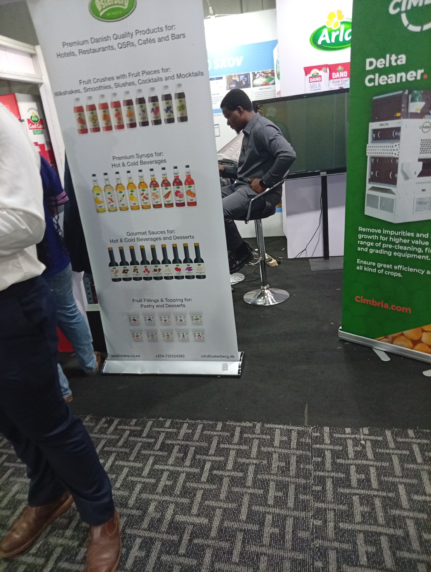 An indoor scene within an exhibition hall in Itirin, Nigeria, features three individuals and multiple branded display banners. In the left foreground, the lower torso and legs of a person are visible, clad in a white shirt, dark blue trousers, and brown leather shoes, appearing to be walking right-to-left. Immediately behind, another person's legs, wearing blue jeans, are partially visible. In the mid-ground right, a man with dark skin and short dark hair, dressed in a dark grey long-sleeved shirt and trousers, is seated on a chrome-legged bar stool. He gazes downwards and to his left, with a dark smartwatch on his left wrist. Dominating the left-center is a white vertical banner for "Osterberg," displaying "Premium Danish Quality Products" across various categories: "Fruit Crushes," "Premium Syrups," "Gourmet Sauces," and "Fruit Fillings & Topping," each illustrated with product bottles or containers. Contact information for Kenya and Denmark is present at the bottom. To the right, a green vertical banner for "CIMBRIA" promotes "Delta Cleaner" equipment for "Remove impurities and growth for higher value range of pre-cleaning, fir and grading equipment," featuring an image of a white machine. Behind this banner, "Arla" and "DANO MILK" branding are discernible. A large, dark flat-screen display on a stand is positioned behind the seated man. The floor is covered with a dark grey carpet featuring a light grey geometric pattern, with a visible seam. The background consists of white partition walls.