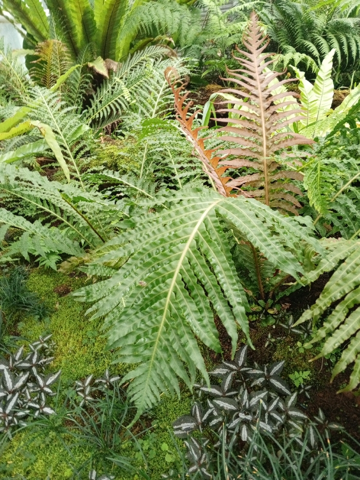 Lush greenery fills the frame, dominated by various ferns. A large, green fern with distinctive, serrated fronds takes center stage. Brown-toned fern fronds appear amongst the green. A carpet of moss and smaller, patterned plants, with dark leaves and silver stripes, cover the ground beneath the ferns. The scene evokes a dense, tropical environment.