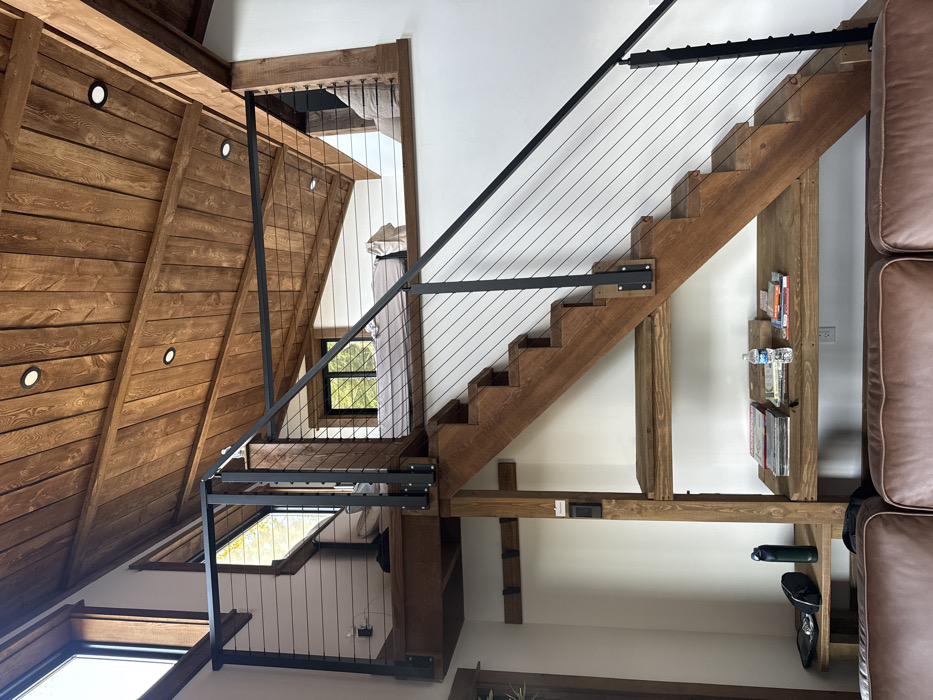 This image depicts the interior of a multi-level residential space in Otego, United States, showcasing a modern rustic design. The dominant features are a substantial wooden staircase and a visible mezzanine loft level. The space features a sloped ceiling constructed from light brown wood planks with multiple circular recessed lights. Walls are painted white. The wooden staircase ascends to the right, featuring open risers and a black metal railing with horizontal stainless steel cables. At the top of the stairs, a loft area is visible, also enclosed by a matching black metal and cable railing. On this loft level, a bed with a light-colored mattress and pillows is present, situated beneath a large window that offers a view of green foliage outside. Another small, dark object rests on the floor in the leftmost section of the loft. Beneath the staircase, a long wooden shelf or desk is integrated into the structure. On this shelf, a stack of magazines or books, a clear plastic water bottle, and other miscellaneous items are arranged. To the left of the staircase, a section of white wall features a rustic wooden coat rack with three hooks. A small, black rectangular device, likely a thermostat or light switch, is affixed to the main wooden support beam of the staircase. The foreground of the image shows the top cushions of a brown leather sofa. No individuals are present in the scene.