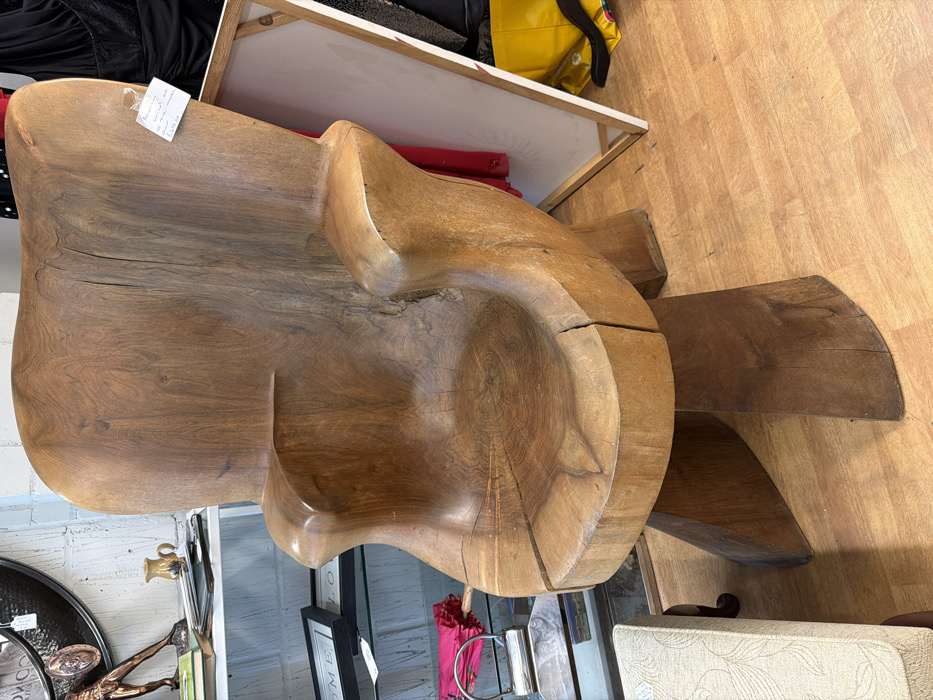 The image displays a large, rustic armchair carved from dark brown wood, situated indoors, likely within a retail or second-hand establishment in Maidstone, United Kingdom. The chair exhibits a high back, broad armrests, and a deeply scooped seat, all showcasing natural wood grain, knots, and visible cracks, particularly on the seat surface. It is supported by three thick, angular wooden legs. A small, rectangular white tag with handwritten text is affixed to the upper right side of the chair's back. The floor consists of light-colored wood-effect laminate. To the immediate left of the chair, a white shelving unit with glass shelves holds assorted items: a large, dark, circular decorative object, a bronze-toned figurine resembling a male athlete, a small ceramic jug, a stack of books or magazines, a framed item partially displaying "HOME," a crumpled pink umbrella, and a silver-colored handbag. To the right of the chair, a large white-framed object, possibly a mirror or canvas, leans against a wall. Behind it, dark and red fabrics are visible, with a yellow bag resting on the floor. No individuals, explicit actions, or interactions are present in the scene.