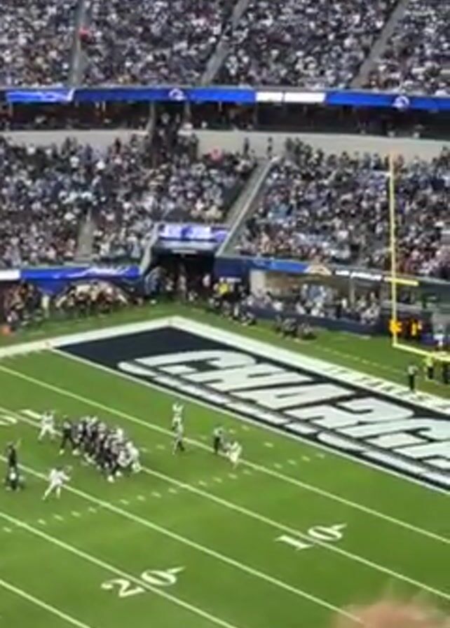 wide, high-angle view of an American football game in a large stadium packed with spectators. The teams, one in white and the other in black uniforms, are positioned on the field near the end zone with the word “CHARGERS” displayed in large letters. A player in white kicks the football, and the ball goes through the goalposts. The crowd reacts with cheers and applause. The field is green with yard line markings. The environment suggests a well-attended professional sports event.