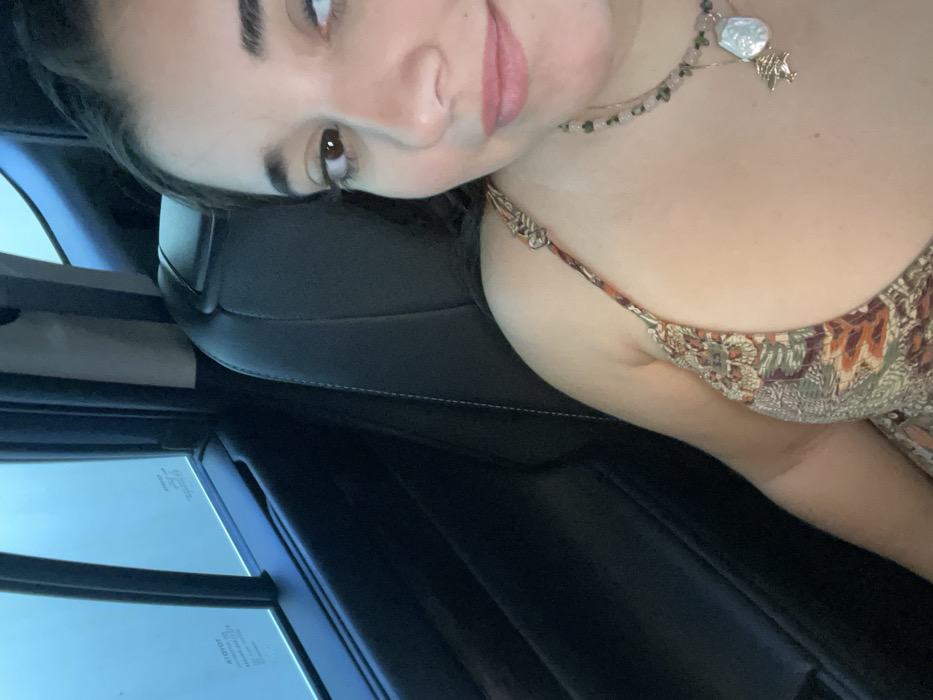 A female individual is depicted from the mid-chest up, seated inside a vehicle