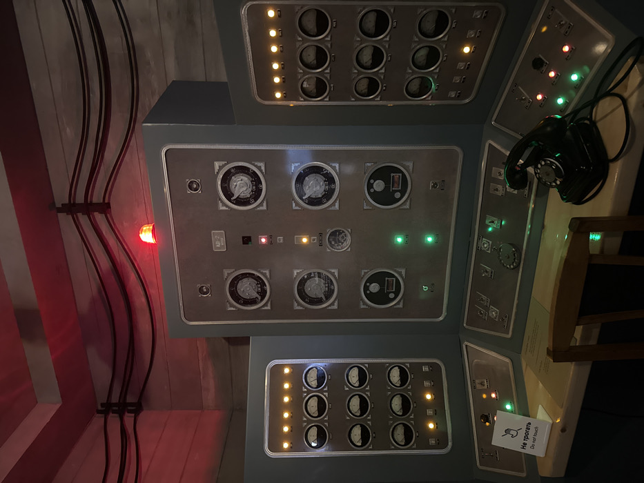 A vintage control panel with multiple sections displays illuminated lights and analog gauges. Wires run along the wall behind the panel. A rotary dial telephone sits on a ledge next to the panel. A small sign reading "Не трогать / Do Not Touch" is visible. The panel features a combination of yellow, green, and red lights, along with dials and switches of varying designs.