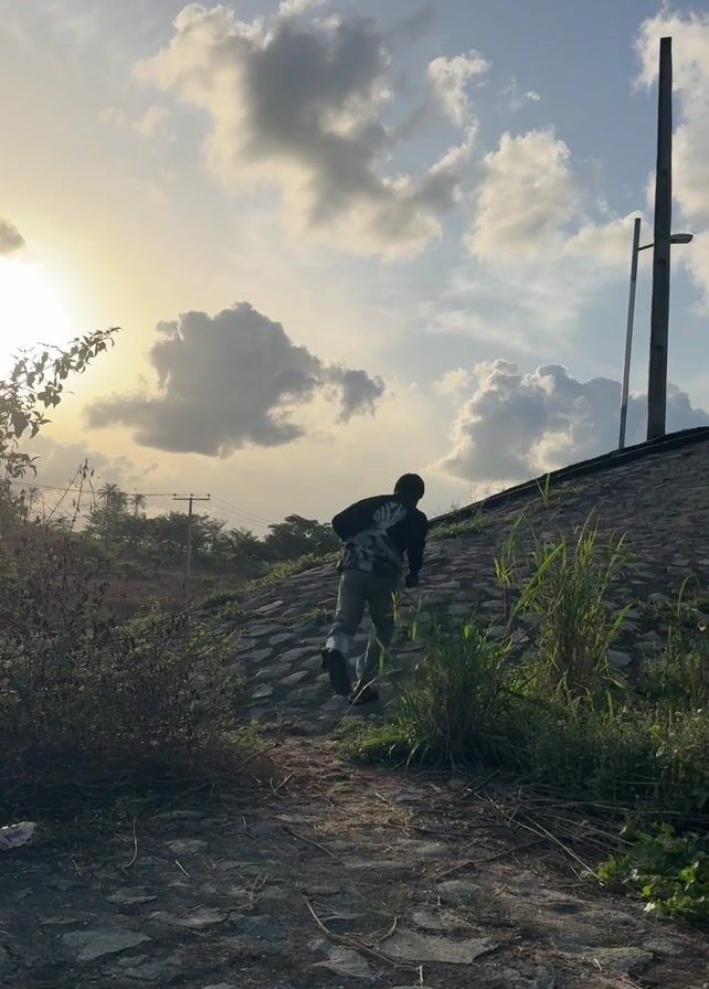 two people running up a small hill covered in rocks. The person in front is wearing a dark shirt and light-colored pants. The person behind is wearing a tank top and shorts. The sky is partly cloudy with the sun shining through the clouds. There are some power lines and a tall pole visible in the background. There is also some grass and vegetation growing on the hillside.