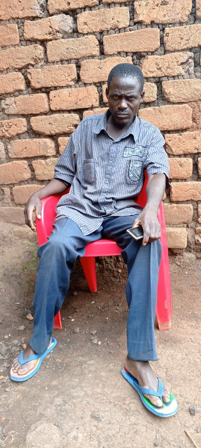 An adult male is seated on a red plastic chair, facing the viewer directly, against a backdrop of an unfinished brick wall
