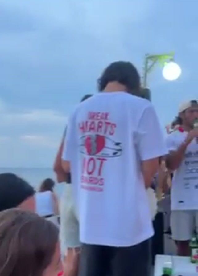 group of people gathered on what appears to be a rooftop or platform near the sea. The sky is cloudy. Some people are standing, others are seated. There's a man wearing a white t-shirt with "BREAK HEARTS IOT BARDS INDONESIA" printed on the back. Another man is wearing a white soccer jersey. A light fixture resembling a globe is visible. Some people are holding drinks. There seems to be music playing. Some people are interacting, others are observing.