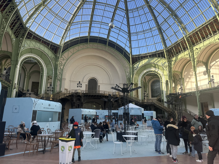 This image depicts the interior of the Grand Palais in Paris, France, specifically the vast Nave, identifiable by its iconic arched glass-and-steel domed roof with green and cream-colored structural elements. Natural daylight illuminates the expansive space. The light blue-grey floor hosts an event setup featuring multiple light blue, rounded rectangular stalls labeled "LES ÉCHOPPES ÉPHÉMÈRES" (The Ephemeral Stalls), accompanied by numerous small round tables with a mix of white metal and brown wooden chairs. Black metal truss structures and a white tent are also present. A moderate crowd of individuals, including adults and children dressed in winter clothing, is distributed throughout the area. People are observed seated at tables, standing in groups, conversing, and moving about. In the foreground, a child in a red hat and orange shirt stands beside a tall, white recycling bin with green logos. A reflective disco ball hangs from the ceiling structure.