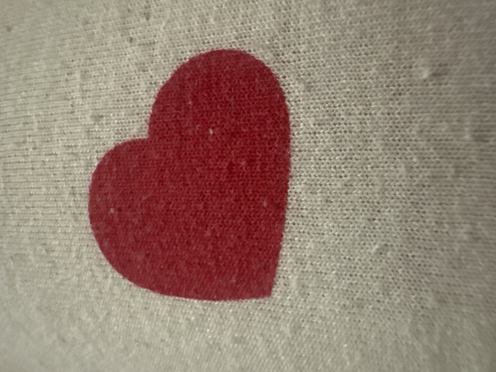 The scene, located in the city of Sofia, Bulgaria, presents a close-up, overhead view of a solid red heart motif on a light-colored textile. The fabric, off-white or light beige, displays a discernible woven or knitted texture with minor surface pilling and individual fibers visible across its surface. The heart shape is centrally positioned within the frame, appearing as an integral part of the textile design, likely printed or affixed. No specific landmarks, broader environmental context, human subjects, actions, or interactions are evident, preventing further identification of a precise location within Sofia.