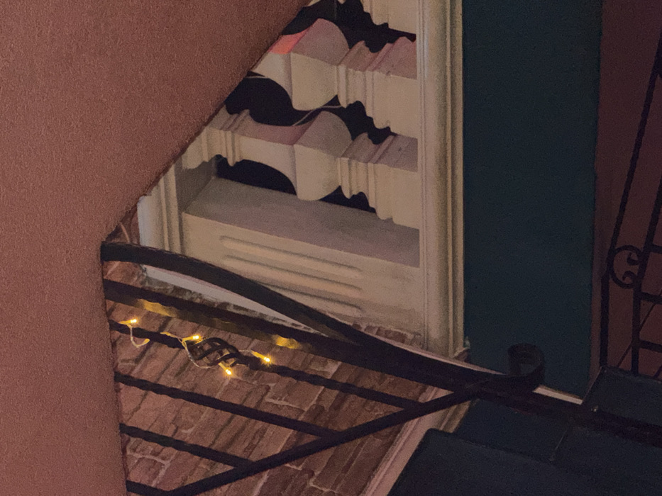 The image depicts an architectural detail scene in Varna, Bulgaria, viewed from a low perspective looking upwards and across. A textured, reddish-brown ceiling or overhead structure diagonally crosses the upper portion of the frame. To the left, a dark, wrought-iron railing with vertical elements and decorative twists is prominently featured. Several warm-toned string lights are intertwined around this railing. Behind the railing, a brick wall laid in a stretcher bond pattern is visible. To the right, a light-colored balustrade composed of multiple classic balusters, casting defined shadows, extends horizontally. Below the balustrade is a section of a dark teal-green wall. In the lower right, a small portion of another dark railing with scrollwork is visible above a dark reddish-brown surface. The scene is devoid of people or direct actions.
